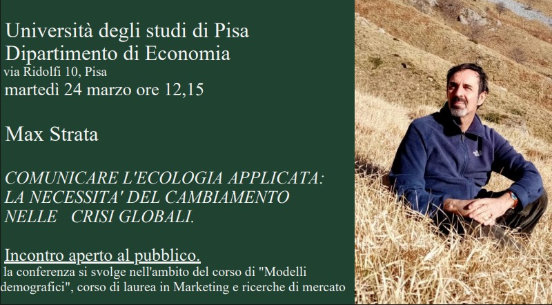 Nell’ambito del corso “Modelli demografici” tenuto dal prof. Pietro Manfredi per il corso di laurea in Marketing e ricerche di mercato, martedì 24 marzo alle ore 12.15 è organizzato un incontro con Max Strata, comunicatore, docente ed educatore che per molti anni si è occupato di formazione e comunicazione in materia di tutela ambientale ed ecologia sociale. L’incontro ha per titolo Comunicare l’ecologia applicata: la necessità del cambiamento nelle crisi globali.